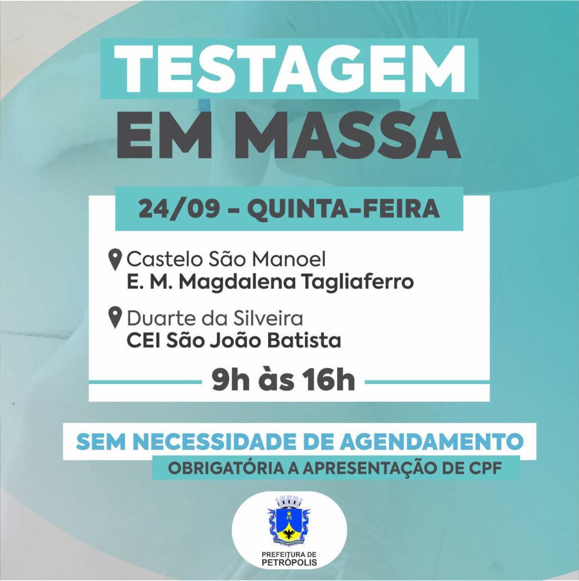 Nesta quinta-feira (24), as ações de testagens para a covid-19 vão acontecer na Escola Municipal Magdalena Tagliaferro, no Castelo São Manoel, e no Centro de Educação Infantil São João Batista, no Duarte da Silveira. Os exames serão realizados das 9h às 16h. Não é preciso agendamento, basta comparecer aos locais com o CPF. Os resultados ficam prontos em 15 minutos.