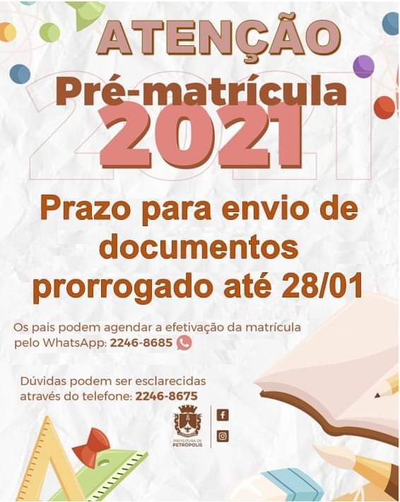 Os pais ou responsáveis por alunos que vão ingressar na rede municipal de ensino devem enviar a documentação necessária para a efetivação da matrícula até o dia 28. Todo o atendimento pode ser feito pelo whatsapp 2246-8685. Dúvidas podem ser esclarecidas pelo telefone 2246-8675.