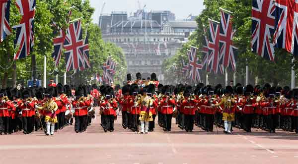 Os responsáveis pela guarda do Palácio de St. James, geralmente liderados por uma Banda Regimental ou Corpo de Tambores, marcham pelo Mall para colocar sua Cor Regimental na sala da guarda, localizada no Tribunal do Convento, no Palácio de St. James.