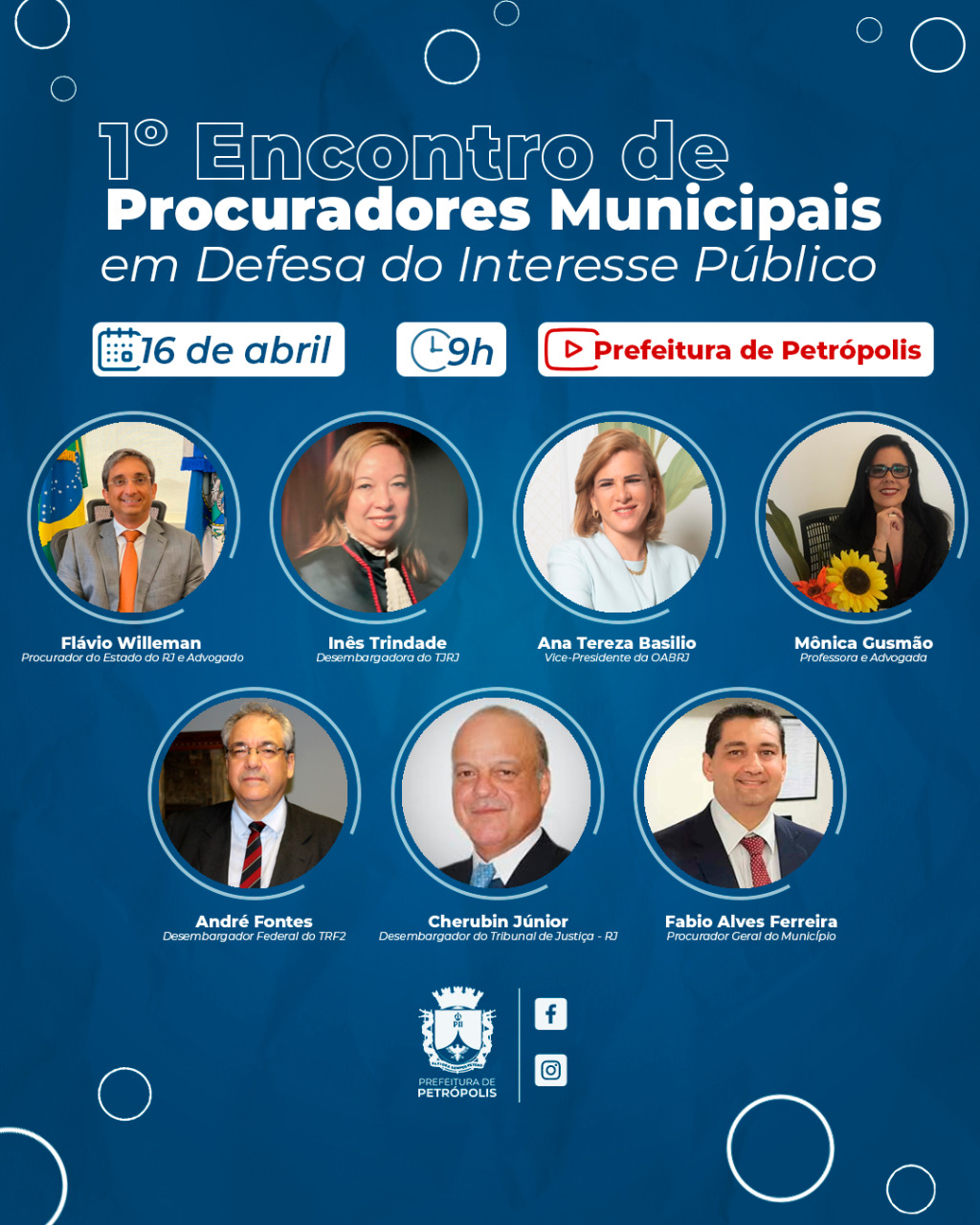 Na próxima sexta-feira (16) será realizado, com apoio da Prefeitura, o 1º Encontro de Procuradores Municipais em Defesa do Interesse Público. O evento será transmitido pelo canal do Youtube do governo municipal interino a partir das 9h. O encontro propiciará o debate aprofundado sobre políticas públicas dentro da realidade do município.