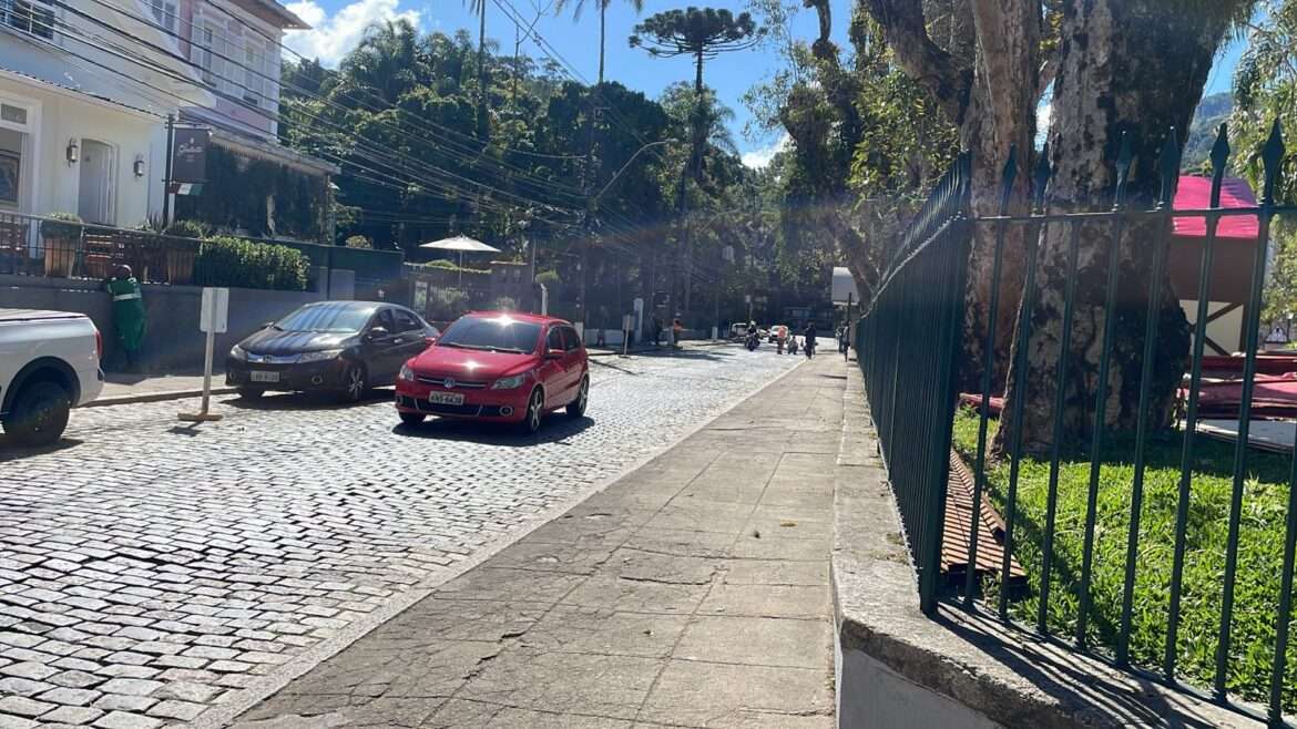 Para a montagem da 36ª Bauernfest, a Rua Alfredo Pachá, no Centro, está fechada para o trânsito de veículos. A Rua Padre Siqueira está com a mão invertida.