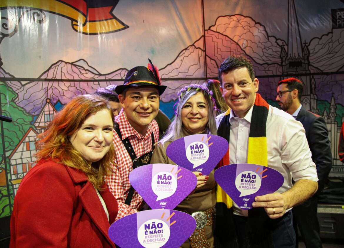 “É importante trazer essa campanha para Bauernfest em parceria com o Governo do Estado. A festa precisa ser segura para todas e a Secretaria da Mulher estará durante a Bauern, com um estande recebendo as mulheres, dando orientações e difundindo a campanha Não é Não, respeite a minha decisão!”, frisou a secretária de Políticas para Mulheres, Rosângela Stumpf.