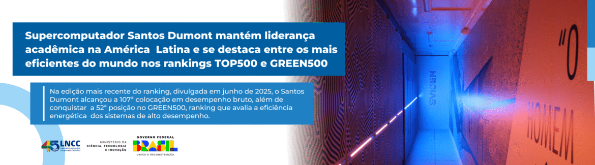 Na edição mais recente do ranking, divulgada em junho de 2025, o Santos Dumont alcançou a 107ª colocação em desempenho bruto, além de conquistar a 52ª posição no GREEN500, ranking que avalia a eficiência energética dos sistemas de alto desempenho. Com isso, o Santos Dumont também se consolida como o supercomputador mais verde da América Latina. Portanto, mais do que potência, o Santos Dumont destaca-se pela eficiência energética, refletindo o compromisso do Brasil com uma inovação responsável e alinhada aos grandes desafios globais nas áreas de energia e meio ambiente.