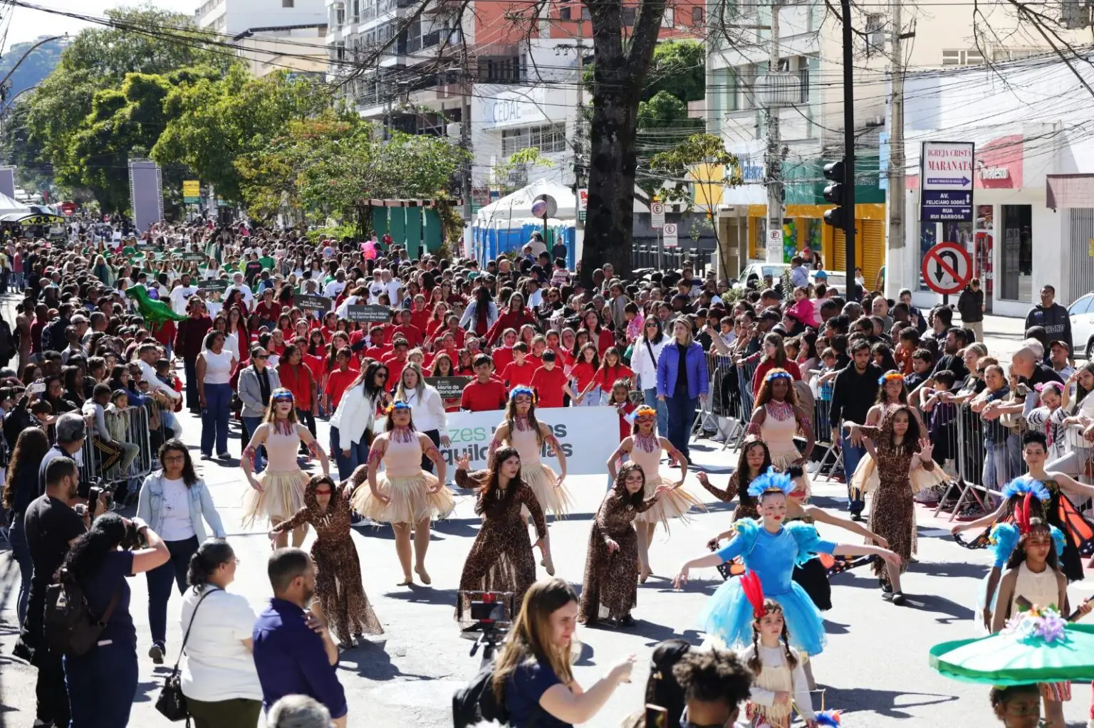 Teresópolis é terra de muitas vozes, de histórias que ecoam das montanhas à cidade, do campo ao centro urbano, do passado ao presente. O desfile convidou à celebração das diversas identidades que moldaram e continuam moldando nossa cidade. Divididos em 12 grupos, cerca de 2.300 alunos da Educação Infantil ao nono ano do Ensino Fundamental desfilaram acompanhados por bandas marciais da Rede Municipal e a participação especial da Corporação do C. E. Higino da Silveira.