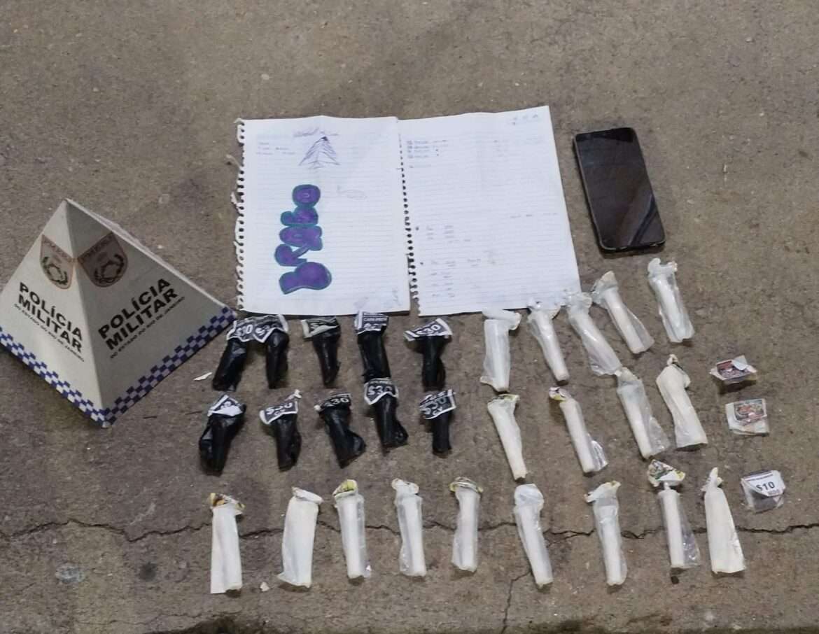 28 cápsulas de cocaína, 03 pedras de crack, 03 tabletes de maconha, além de 01 telefone celular, e folhas com a contabilidade do tráfico de drogas, foram apreendidos por Policiais Militares na noite deste domingo (20), na praça de Cascatinha.