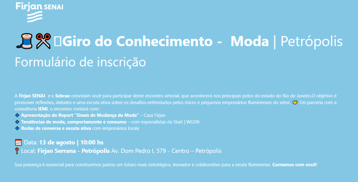 Com foco no fortalecimento do setor de Moda, a Firjan, em parceria com o Sebrae, vai promover o “Giro do Conhecimento – Moda”, no dia 13/8, às 10h, na sede da Firjan Serrana, em Petrópolis. O evento vai abordar as tendências do mercado para impulsionar o segmento na região. As inscrições são gratuitas e devem ser feitas no link: https://forms.office.com/r/rYwcDqdWFm.