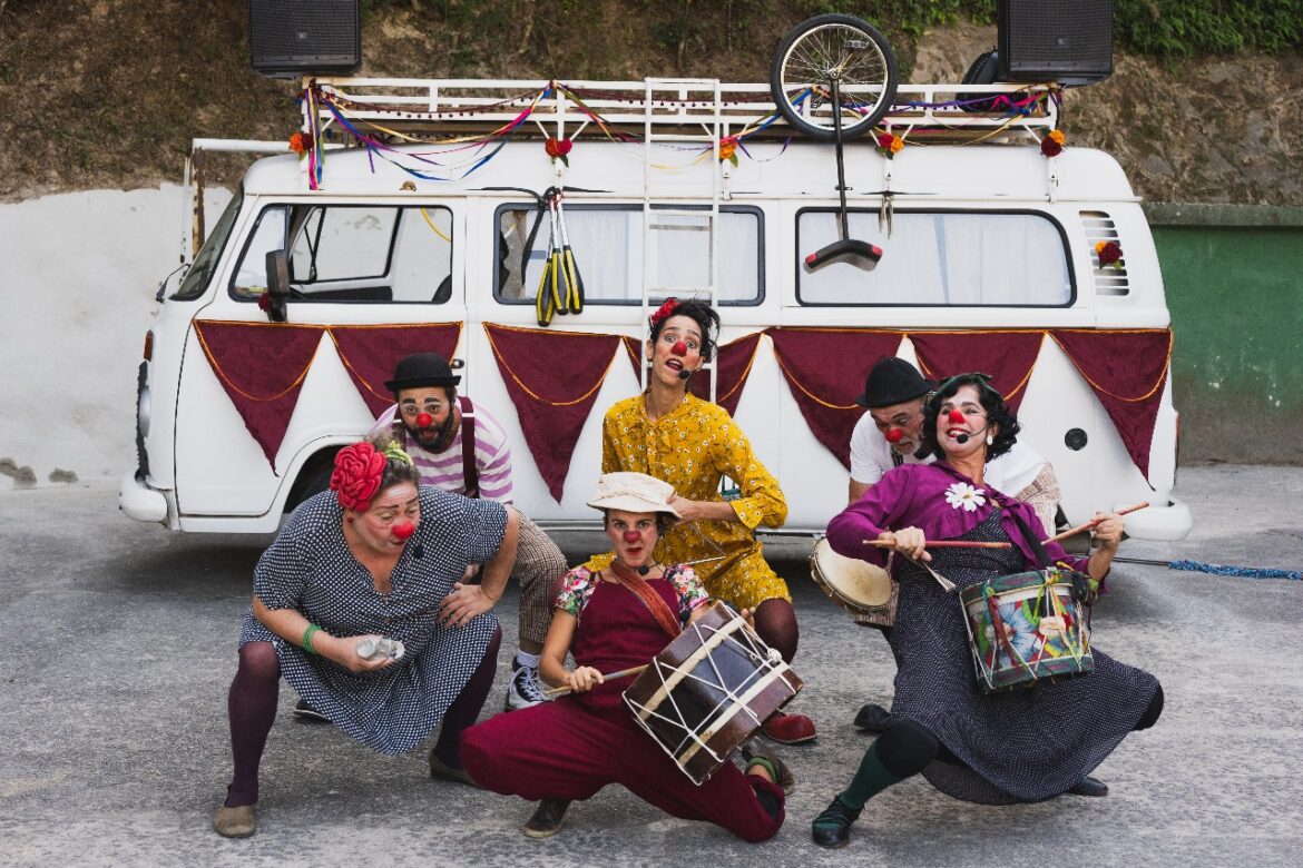 O espetáculo “Fanfarra Komboio” é uma grande brincadeira que mistura as linguagens da palhaçaria (são sete palhaces em cena), do circo e da música, em um passeio por melodias e ritmos, como coco, jongo, cacuriá, ijexá, maracatu, ciranda, dentre outros.