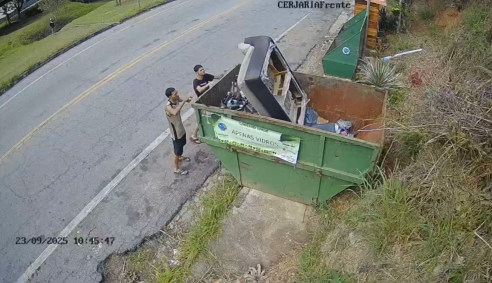 Imagens registradas por câmeras de segurança da empresa Opensat flagraram, no dia 23 de setembro, às 10h45, dois homens despejando um sofá em uma caçamba destinada exclusivamente ao descarte de vidro. O caso aconteceu em Pedro do Rio, distrito de Petrópolis (RJ), e chamou atenção para a importância da conscientização da população quanto ao destino correto dos resíduos.