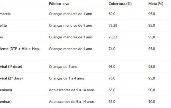 Apesar dos índices baixos, algumas vacinas registraram boa adesão. A tríplice viral, por exemplo, atingiu 96% de cobertura na primeira dose, mas caiu para 76% na segunda.