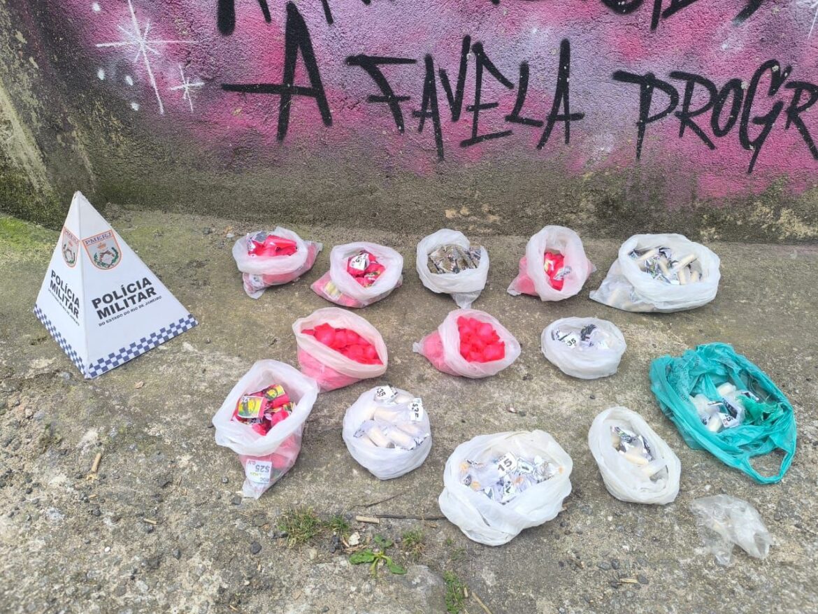 Durante a ação, os agentes localizaram 260 pinos de cocaína (520g), 31 pedras de crack (155g) e 15 pequenos tabletes de maconha (120g).