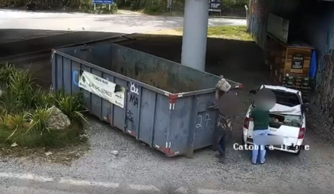 Duas pessoas foram flagradas por câmeras de segurança despejando entulho de concreto em uma caçamba destinada exclusivamente ao descarte de vidro, no Ponto de Entrega Voluntária (PEV) do Catobira, em Itaipava. As imagens mostram os homens retirando os resíduos da caçamba de uma picape branca e despejando o material no local inadequado.