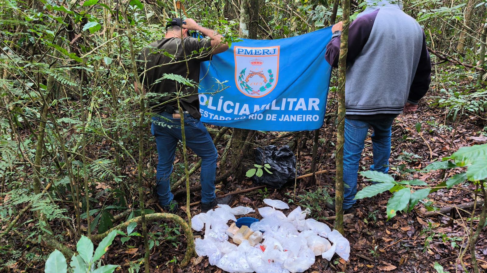 Policiais militares do 26º BPM apreenderam uma grande quantidade de drogas em uma área de mata na Estrada do Secretário, em Pedro do Rio, Na manhã deste sábado (11).