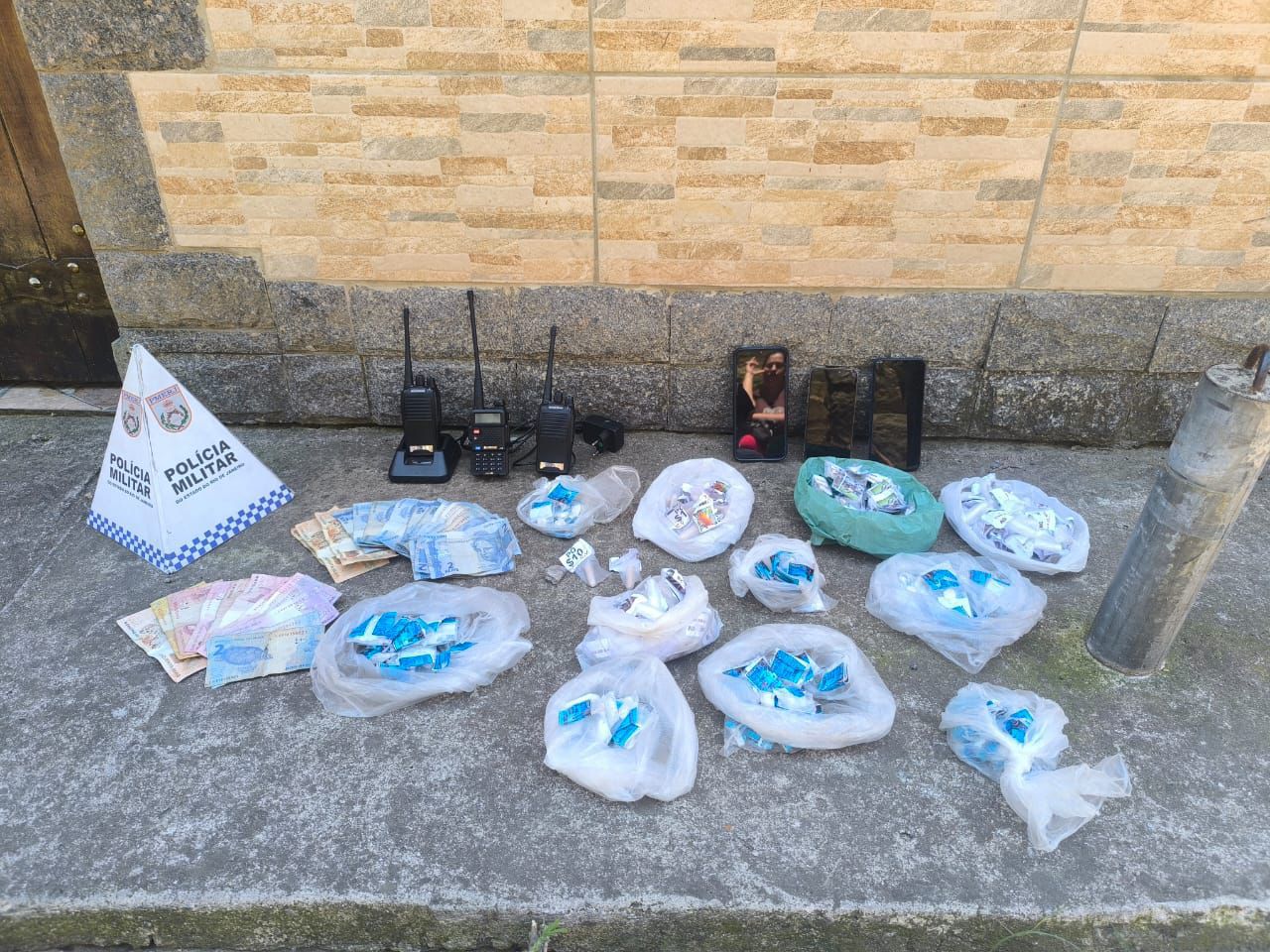 223 pinos de cocaína (450g),38 pedras de crack (115g),39 tabletes de maconha (275g),03 rádios transmissores, 01 base de rádio e 03 celulares,R$ 344,00 em espécie
