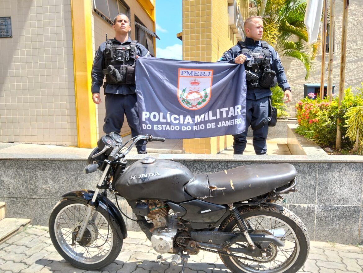 Policiais militares do 38º BPM recuperaram uma motocicleta com registro de roubo, abandonada às margens da BR-040, na altura do km 23, em Moura Brasil, Três Rios, na tarde deste sábado (1º).