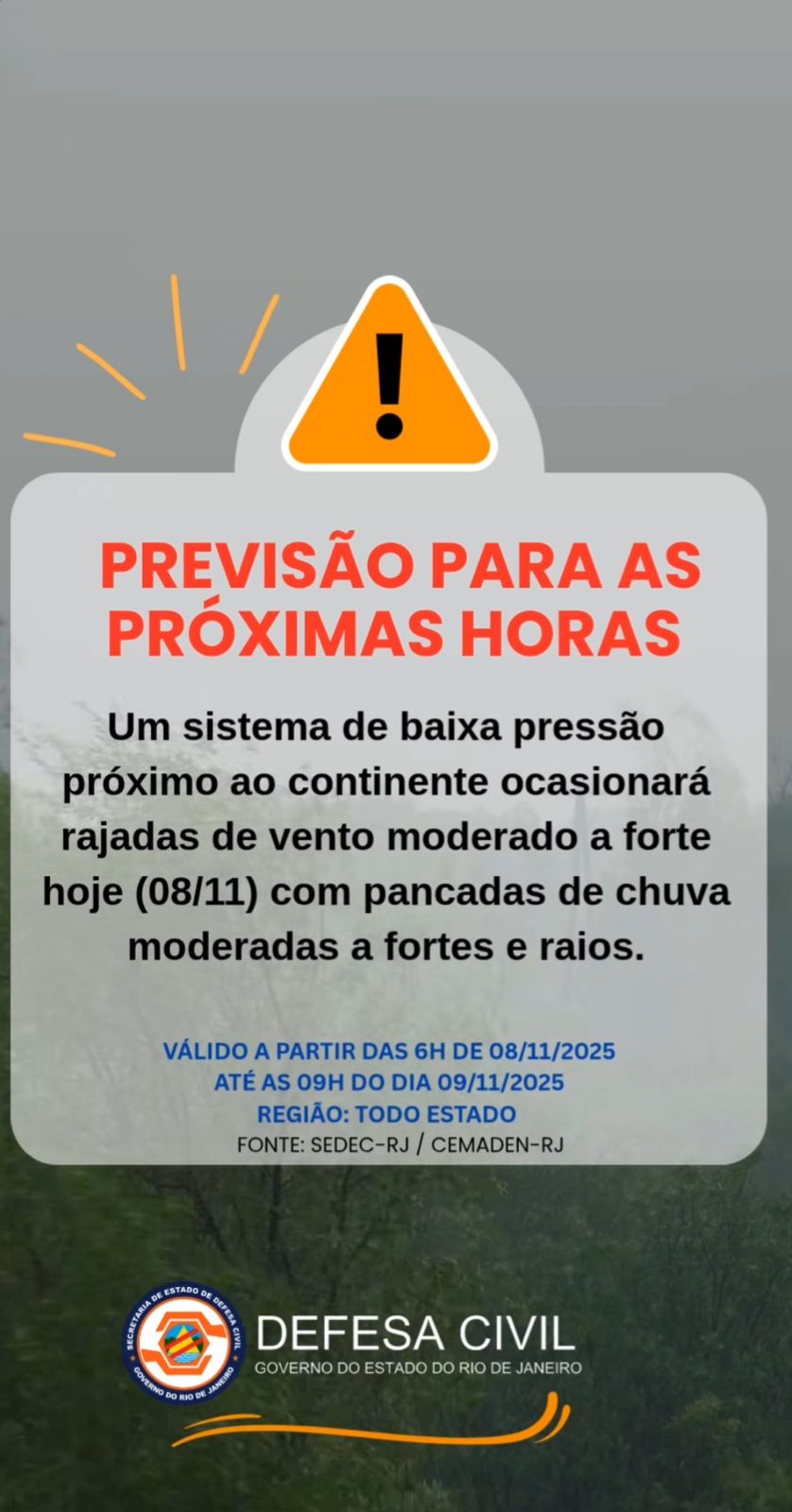 O aviso estadual tem vigência das 6h deste sábado (8) até as 9h de domingo (9), abrangendo todo o território fluminense. Já o alerta emitido pela Defesa Civil de Petrópolis segue válido até as 12h de segunda-feira (10).
