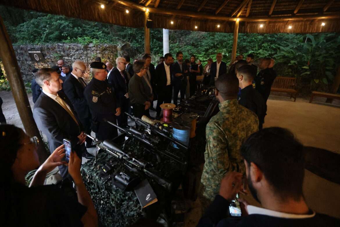 Os governadores embarcaram num tanque blindado do Bope e foram até uma das áreas de treinamento no meio da mata. Ali, policiais apresentaram os armamentos e os equipamentos especiais utilizados nas operações, como fuzis, granadas e detonadores.
