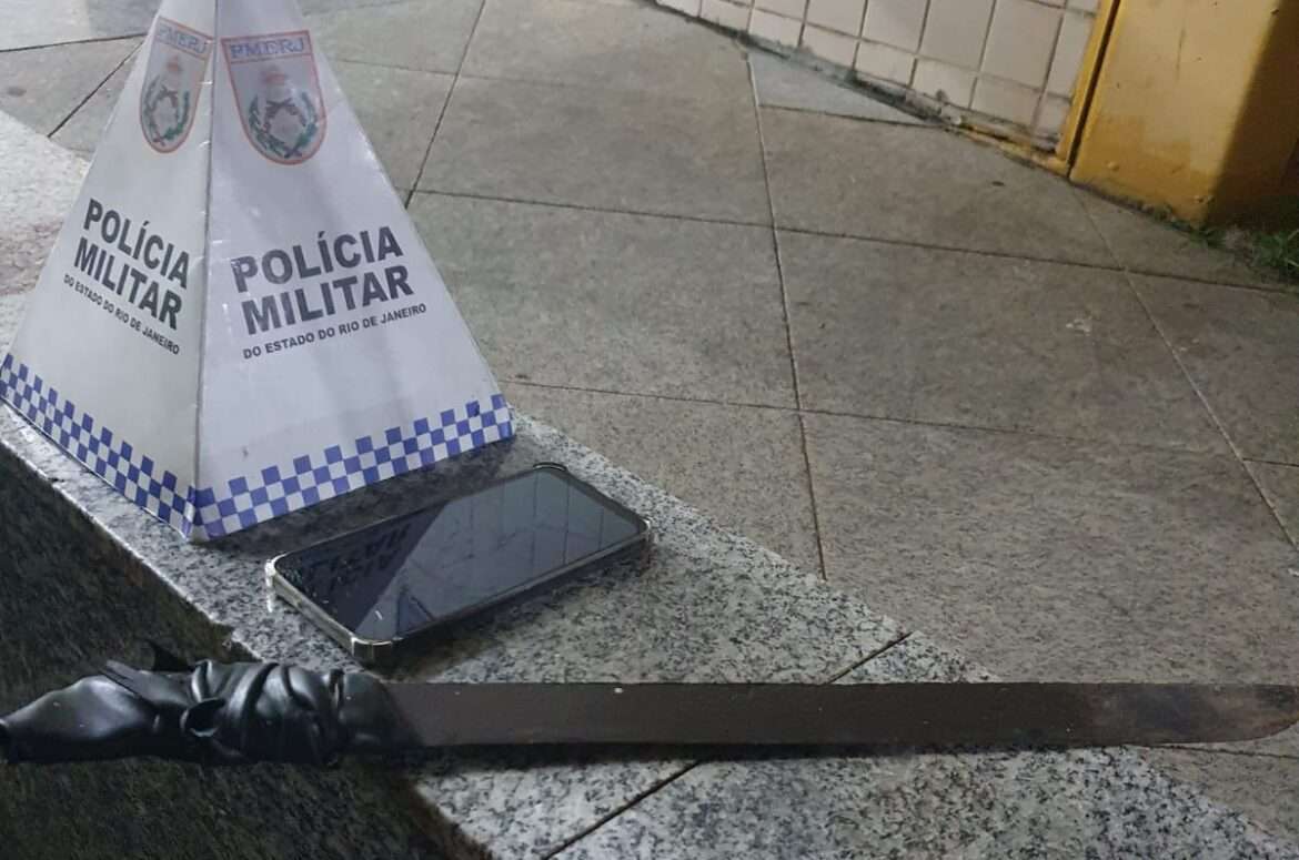 Com ele foram apreendidos um facão de aproximadamente 50 cm e um aparelho celular. O acusado foi encaminhado à 108ª DP, onde permaneceu preso, sendo autuado por ameaça (art. 147 do CP) em conjunto com o art. 7º da Lei Maria da Penha. Ele já possui passagens anteriores por lesão corporal (2022), ameaça (2022), tráfico de drogas (2018) e violência doméstica (2017), segundo consulta ao Portal da Segurança do Estado do Rio de Janeiro.