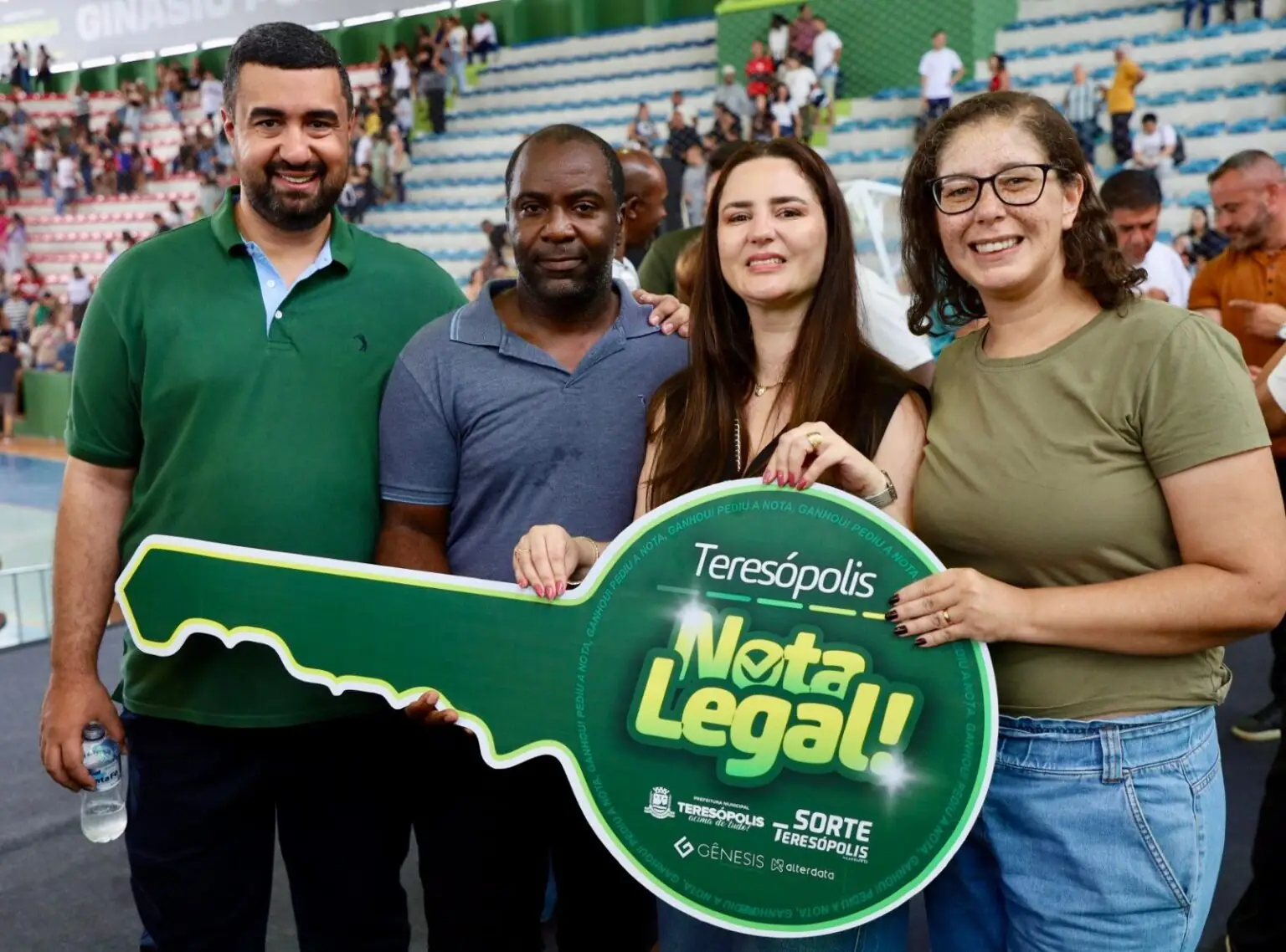 Com o Ginásio Pedrão lotado, o evento contou com a presença do Prefeito Leonardo Vasconcellos, da primeira-dama, Claudia Vasconcellos, secretários municipais, vereadores e contribuintes. A iniciativa tem como objetivo incentivar a cidadania fiscal e a transparência nas transações comerciais realizadas na cidade.