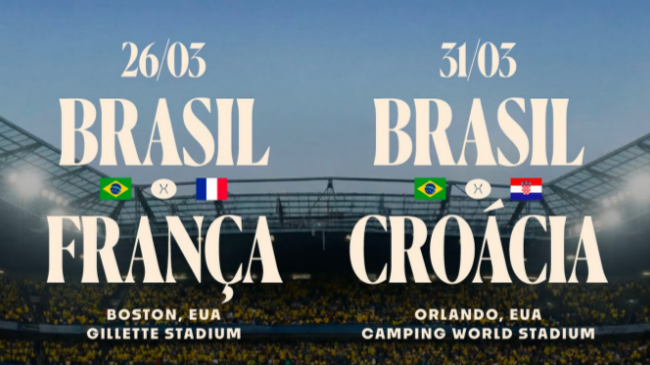 O primeiro compromisso do Brasil será no dia 26 de março, quando enfrentará a França, atual 3ª colocada do ranking de seleções da Fifa, no Gillete Stadium, em Boston (Estados Unidos). O estádio receberá sete partidas do Mundial. No dia 31 de março será a vez de a seleção brasileira medir forças com a Croácia, no Camping World Stadium, em Orlando. Os croatas ocupam a 10ª posição no ranking da Fifa.