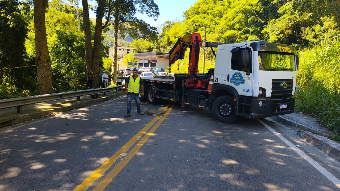 A Estrada União e Indústria, na altura do Posto Dois, em Corrêas, está interditada ao trânsito de veículos na manhã desta quarta-feira (24/12) para a retirada de um ônibus que caiu no rio.