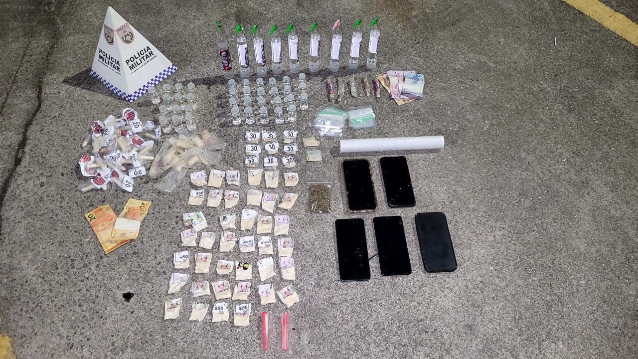 Durante a abordagem, os suspeitos tentaram fugir e se esconder em residências próximas, sendo cercados e detidos sem resistência. Na ação, foram apreendidos 11 pedras de crack, 57 pinos de cocaína, 11 pequenos tabletes de maconha, 9 vidros de lança-perfume, 37 frascos de loló, materiais para endolação, cinco aparelhos celulares e R$ 107,00 em espécie.
