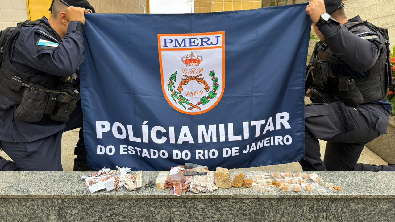 Policiais militares do 38º BPM apreenderam, na tarde desta terça-feira (06), grande quantidade de entorpecentes durante uma ação realizada na Rua Áurea Saudanha, na região do Pátio da Estação, em Três Rios.