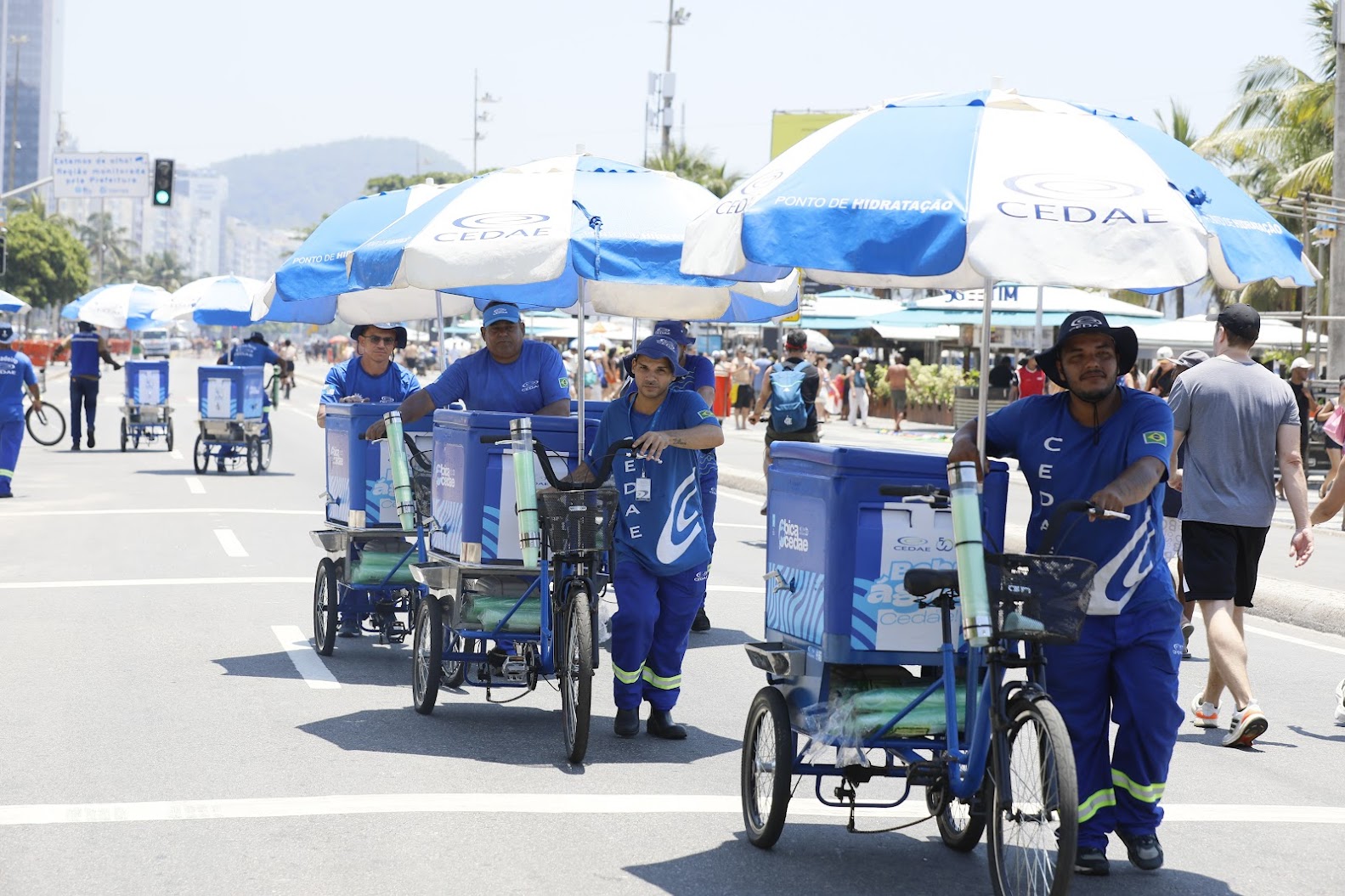 Neste sábado, mais de 10 mil litros de água gelada também foram distribuídos em Copacabana, no Leme e no Aterro do Flamengo, em meio a praias lotadas e sensação térmica elevada.