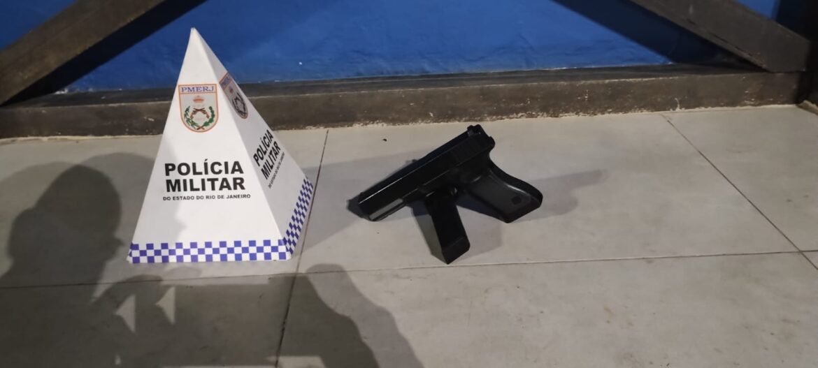 Durante as diligências, o suspeito foi localizado conduzindo o veículo de forma perigosa, em zigue-zague pela via, sendo realizado acompanhamento técnico e cerco para a abordagem. No interior do automóvel, os policiais encontraram um simulacro de arma de fogo.