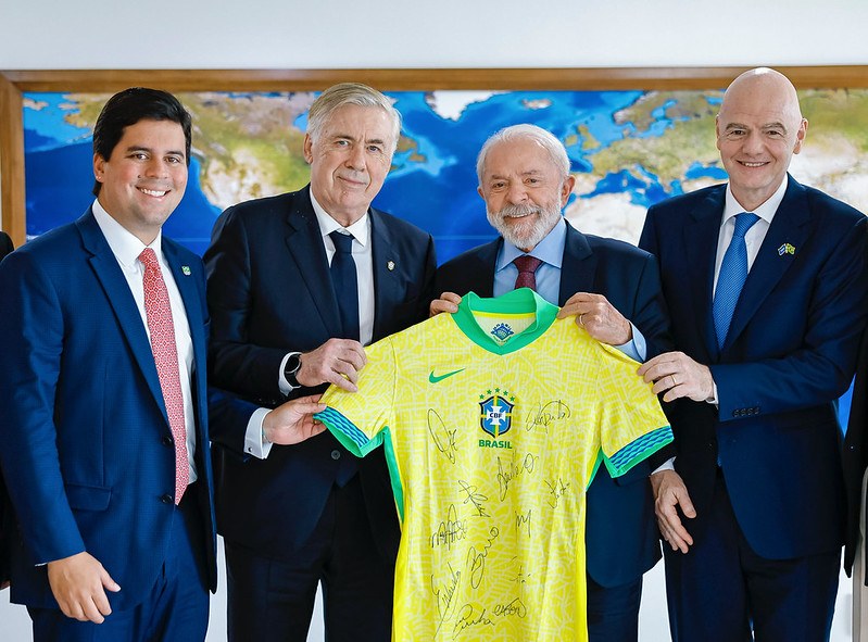 O presidente Luiz Inácio Lula da Silva recebeu nesta segunda-feira (26/1), no Palácio do Planalto, o ministro do Esporte, André Fufuca, o presidente da Federação Internacional de Futebol (FIFA), Gianni Infantino, o presidente da Confederação Brasileira de Futebol (CBF), Samir Xaud, e o técnico da Seleção Brasileira de Futebol, Carlo Ancelotti. No encontro, as autoridades debateram a realização da Copa do Mundo Feminina de Futebol de 2027, que será disputada no Brasil entre 24 de junho e 25 de julho, por 32 seleções, em oito cidades brasileiras.