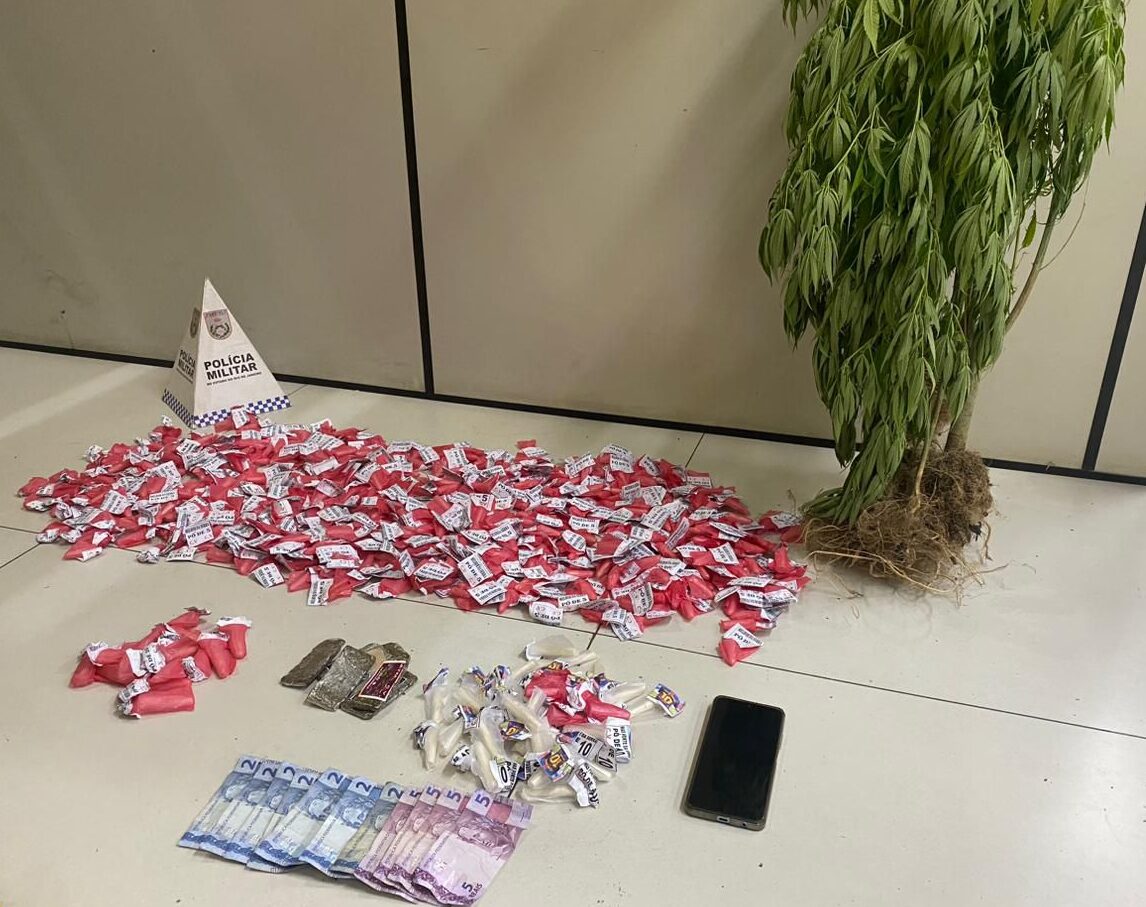 Foram apreendidos: 534 cápsulas de cocaína (862 gramas); 6 tabletes de maconha (57 gramas); 7 pés de maconha, indicando cultivo na área; um aparelho celular e R$ 34,00 em espécie