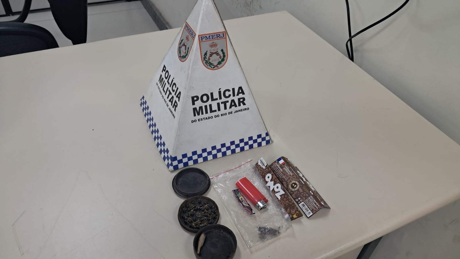 Na abordagem, foi apreendida pequena quantidade da substância, além de um cigarro artesanal pronto para consumo e um triturador com resquícios da droga.