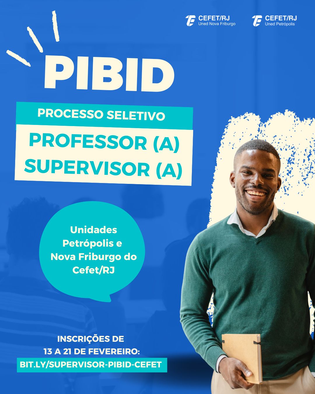 Estão abertas, desde a sexta-feira, 13 de fevereiro, as inscrições para o processo seletivo de professor supervisor do Programa Institucional de Bolsa de Iniciação à Docência (Pibid) no Cefet/RJ. Os interessados podem se inscrever até o dia 21 de fevereiro, por meio do formulário on-line https://bit.ly/supervisor-pibid-cefet.