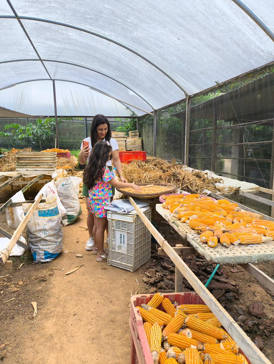 Durante o passeio, os participantes conheceram de perto o plantio e o cultivo de tudo o que é servido aos visitantes. Rosana conduziu o tour pela propriedade, explicando o manejo da terra, a preocupação com a qualidade dos alimentos e o trabalho diário do produtor rural. Teve aprendizado na prática, como a tradicional debulha do milho, além do sistema “colhe e pague”, que permitiu ao grupo colher diretamente nas plantações itens como alface e cebolinha.