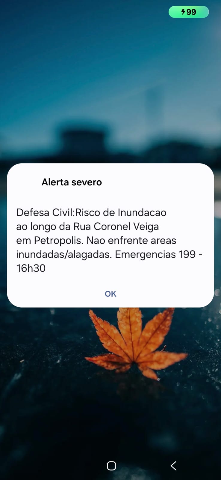 A Defesa Civil emitiu, às 16h30 desta quarta-feira (18/02), um alerta severo via sistema Cell Broadcast/Defesa Civil Alerta para risco de inundação do Rio Quitandinha, na Rua Coronel Veiga, no Centro.