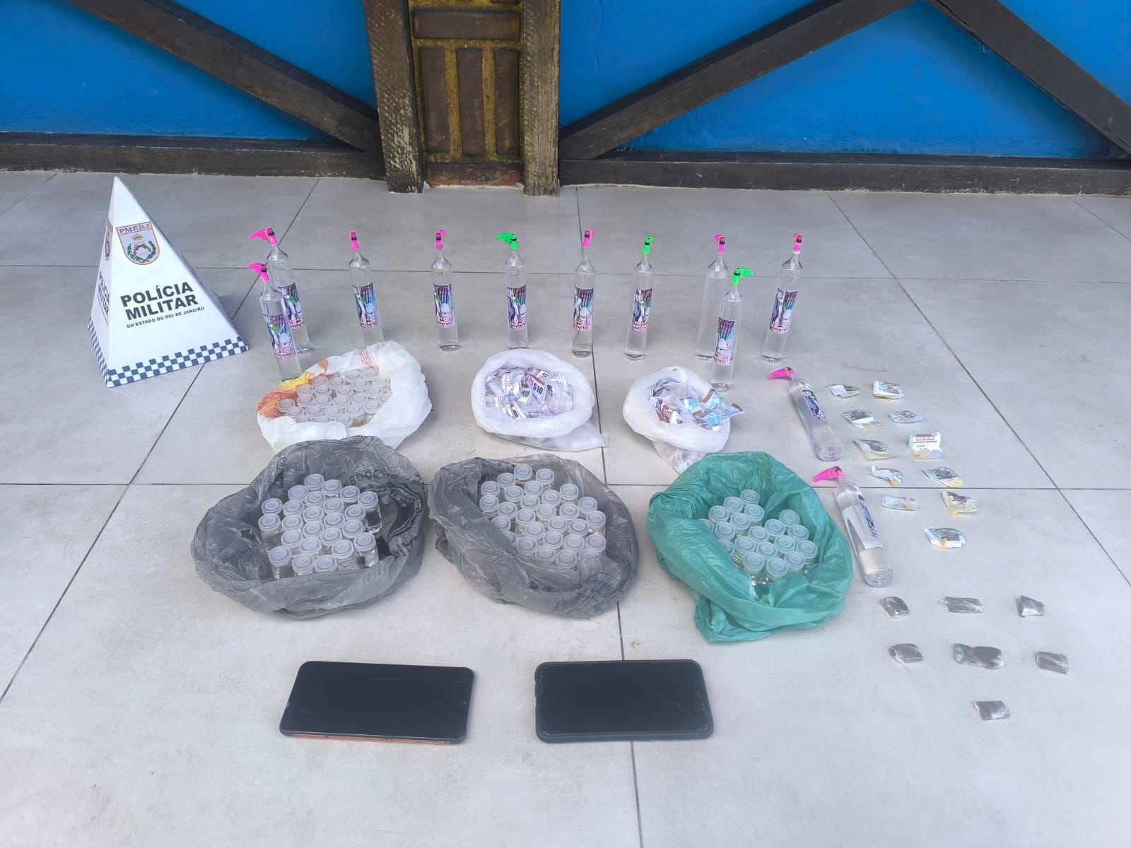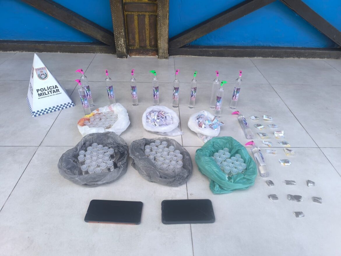 No total, foram apreendidos 72 pinos de cocaína, somando 196 gramas; 11 pedras de crack, com peso aproximado de 55 gramas; sete pequenos tabletes de maconha, totalizando 15 gramas; e 113 frascos de loló, cerca de cinco litros da substância. Dois aparelhos celulares também foram recolhidos.
