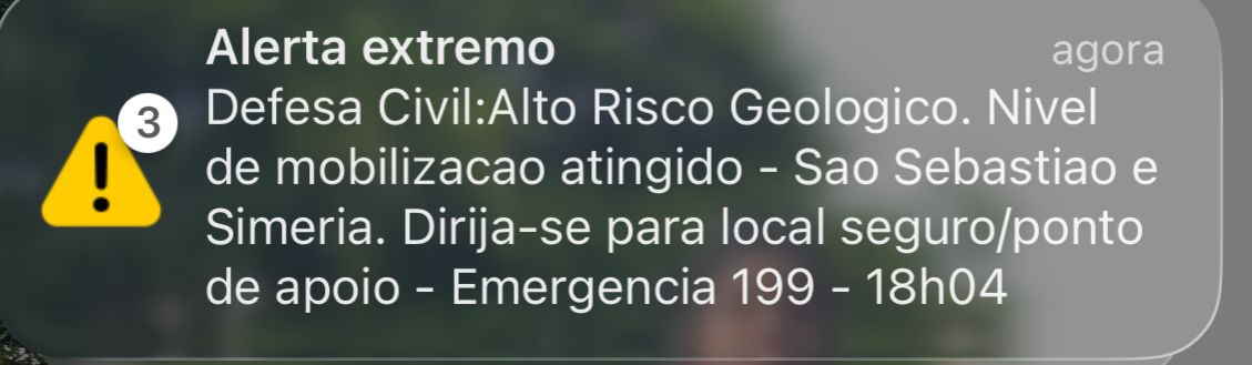 A Defesa Civil emitiu às 18h04 deste domingo (22/02), um alerta via sistema Cell Broadcast/Defesa Civil Alerta extremo para risco geológico nas regiões do São Sebastião e Siméria.