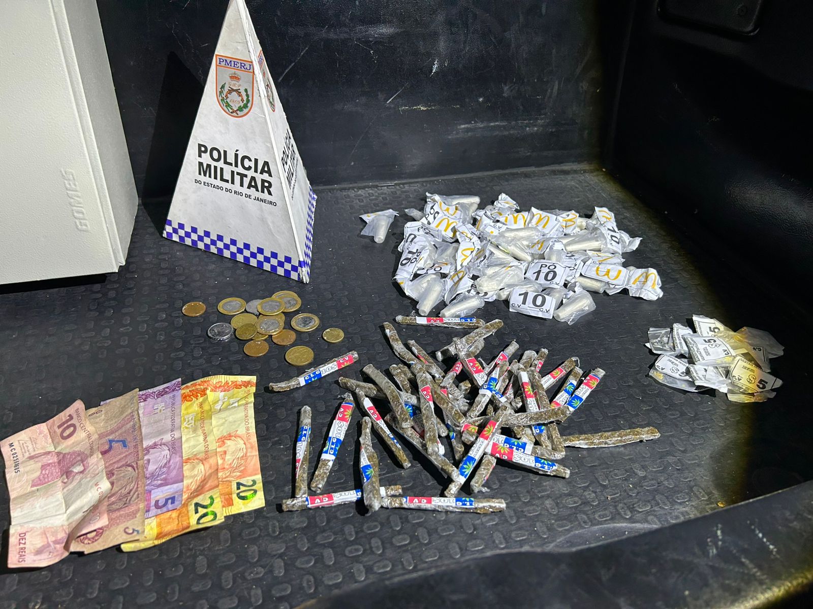 O suspeito, um adolescente de 16 anos, foi abordado após sair de uma servidão indicada na denúncia. Em buscas no local, foram encontradas cargas de entorpecentes escondidas em uma caixa de aterramento, totalizando 13 pedras de crack (50g), 42 pinos de cocaína (95g), 39 tabletes de maconha (115g) e R$ 68,00 em espécie.