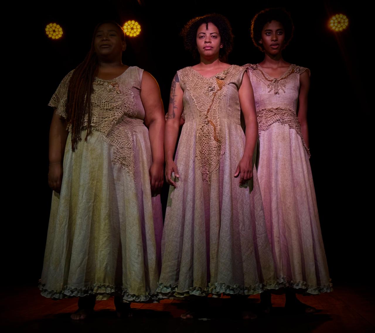No palco, as intérpretes Dandara Claudino, Karine Borges, Leandra Lima e Tainara Claudino conduzem a narrativa, que aborda temas ligados à ancestralidade e às relações humanas. A proposta conta ainda com direção de movimento de Letícia França e figurino assinado por Raquel Theo. A trilha sonora foi desenvolvida de forma colaborativa pelas próprias intérpretes, ampliando a experiência sensorial da montagem. Elementos como tecidos, instrumentos e objetos simbólicos compõem a cenografia, criando um ambiente em constante transformação, que evoca passagem e renovação.