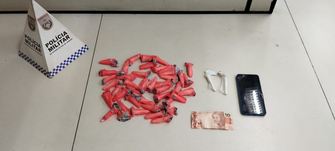 Policiais militares da equipe reservada realizaram uma prisão por tráfico de drogas, na Rua Luiz Winter, na localidade de Duarte da Silveira, em Petrópolis, após levantamento de informações sobre atuação de facção criminosa na região, na noite desta sexta-feira (27).