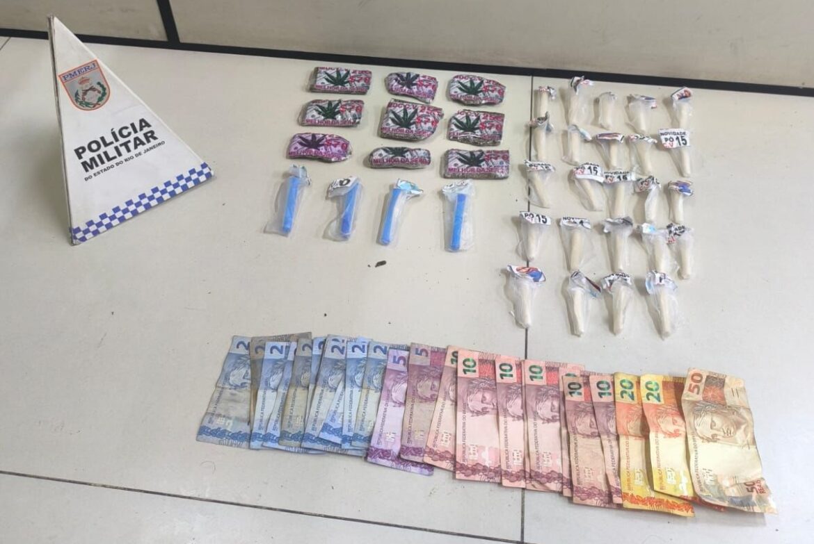 Durante a ação, as equipes procederam à residência do suspeito, onde foram encontrados e apreendidos: 28 pinos de cocaína (aproximadamente 100g), 09 pequenos tabletes de maconha (aproximadamente 215g) e R$ 228,00 em espécie.