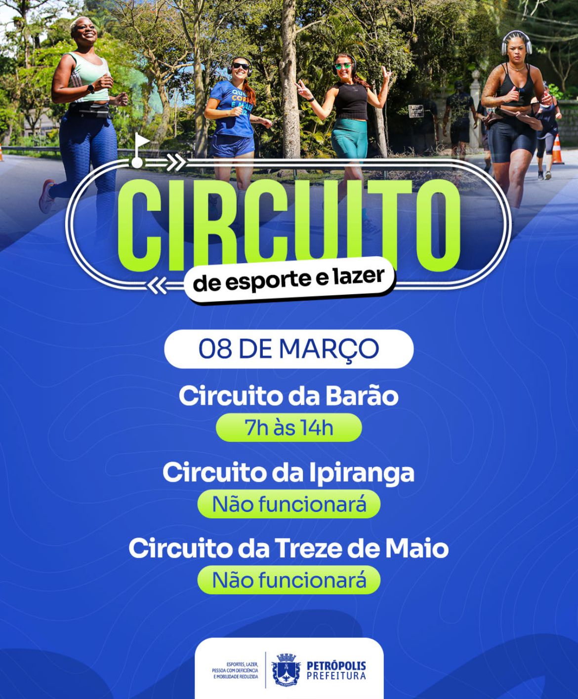 A Prefeitura de Petrópolis realiza neste domingo (8) mais uma edição do Circuito de Esporte e Lazer, em comemoração ao Dia Internacional da Mulher. A atividade será realizada das 7h às 14h, na Avenida Barão do Rio Branco.