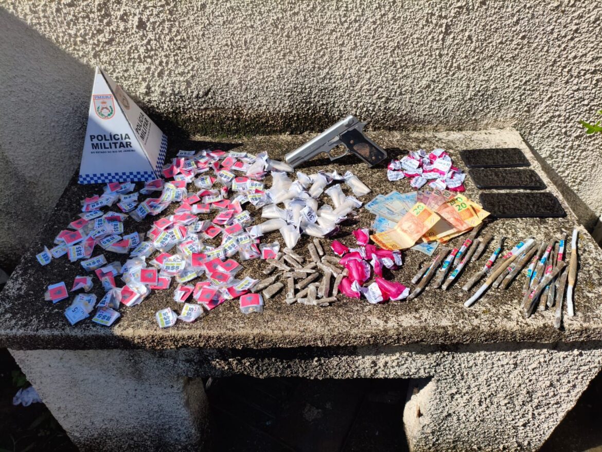 Foram apreendidas 172 pedras de crack, 32 cápsulas de cocaína e 45 trouxinhas de maconha, prontas para comercialização.