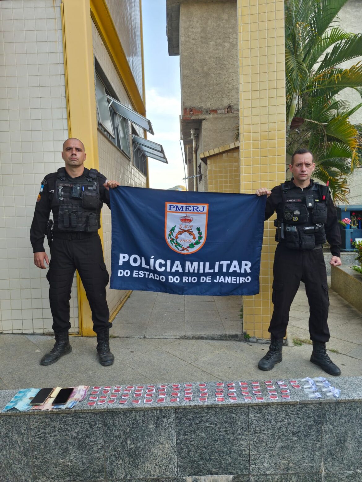 Durante patrulhamento pela Rua 8, as guarnições realizaram ação que resultou na apreensão de entorpecentes e materiais relacionados à atividade criminosa. Ao todo, foram arrecadados 8 pinos de cocaína (8g), 66 pedras de crack (66g), dois aparelhos celulares e a quantia de R$ 502,00 em espécie.