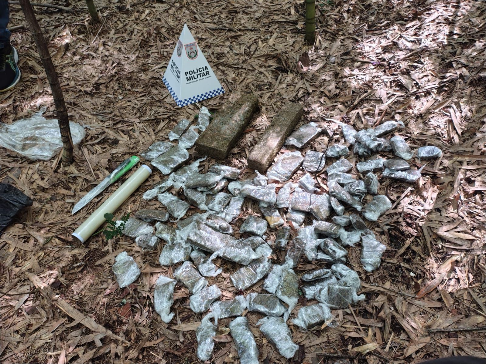 Durante a varredura, os agentes encontraram duas sacas contendo 102 tabletes de maconha, totalizando aproximadamente 4 quilos da droga. Também foram apreendidos materiais utilizados para o fracionamento e preparo do entorpecente, como facas e papel filme.