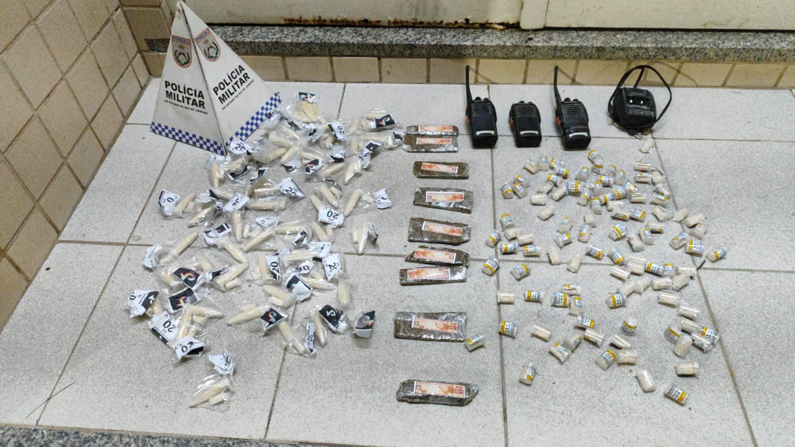 Também foram encontrados três rádios transmissores e uma base de carregamento, equipamentos que, segundo a polícia, são utilizados na comunicação entre integrantes do tráfico.