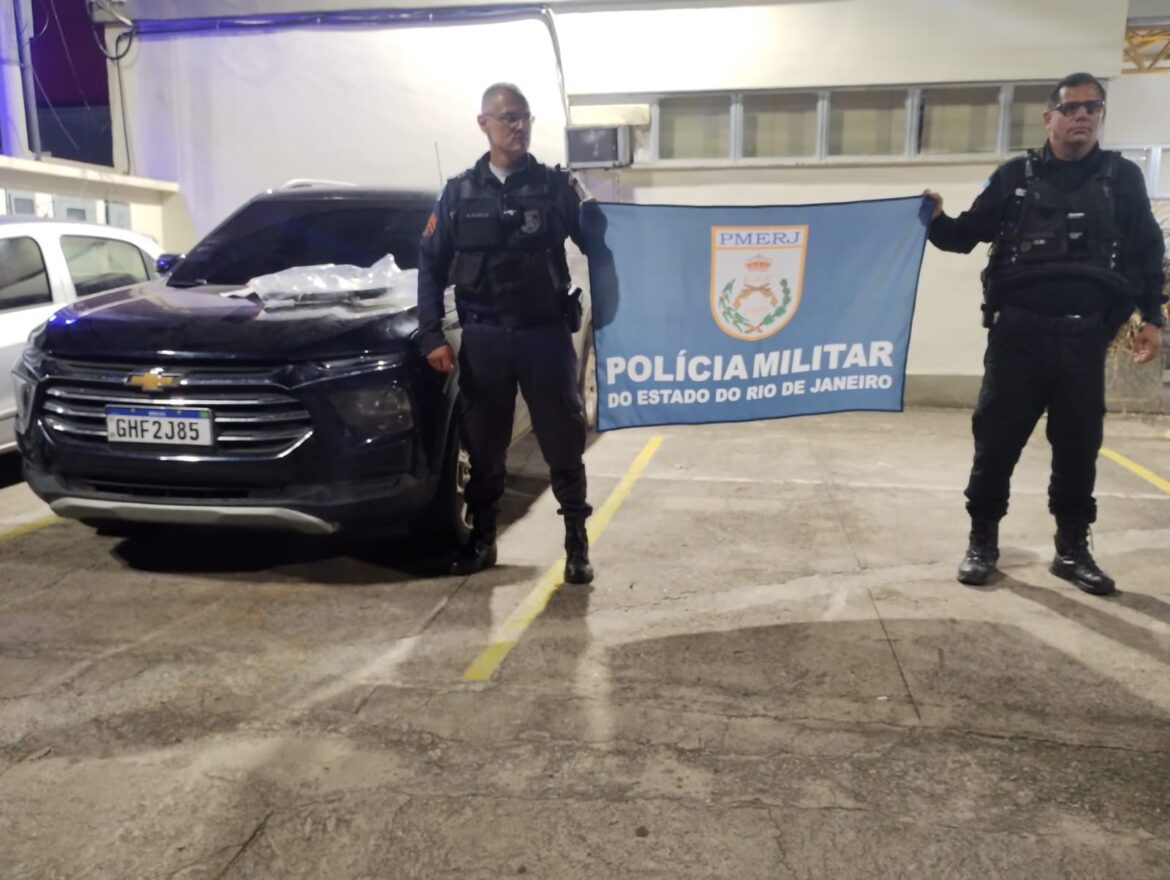 Após consulta, foi constatado que o automóvel, uma Chevrolet Montana, possuía registro de roubo na 33ª DP (Realengo).