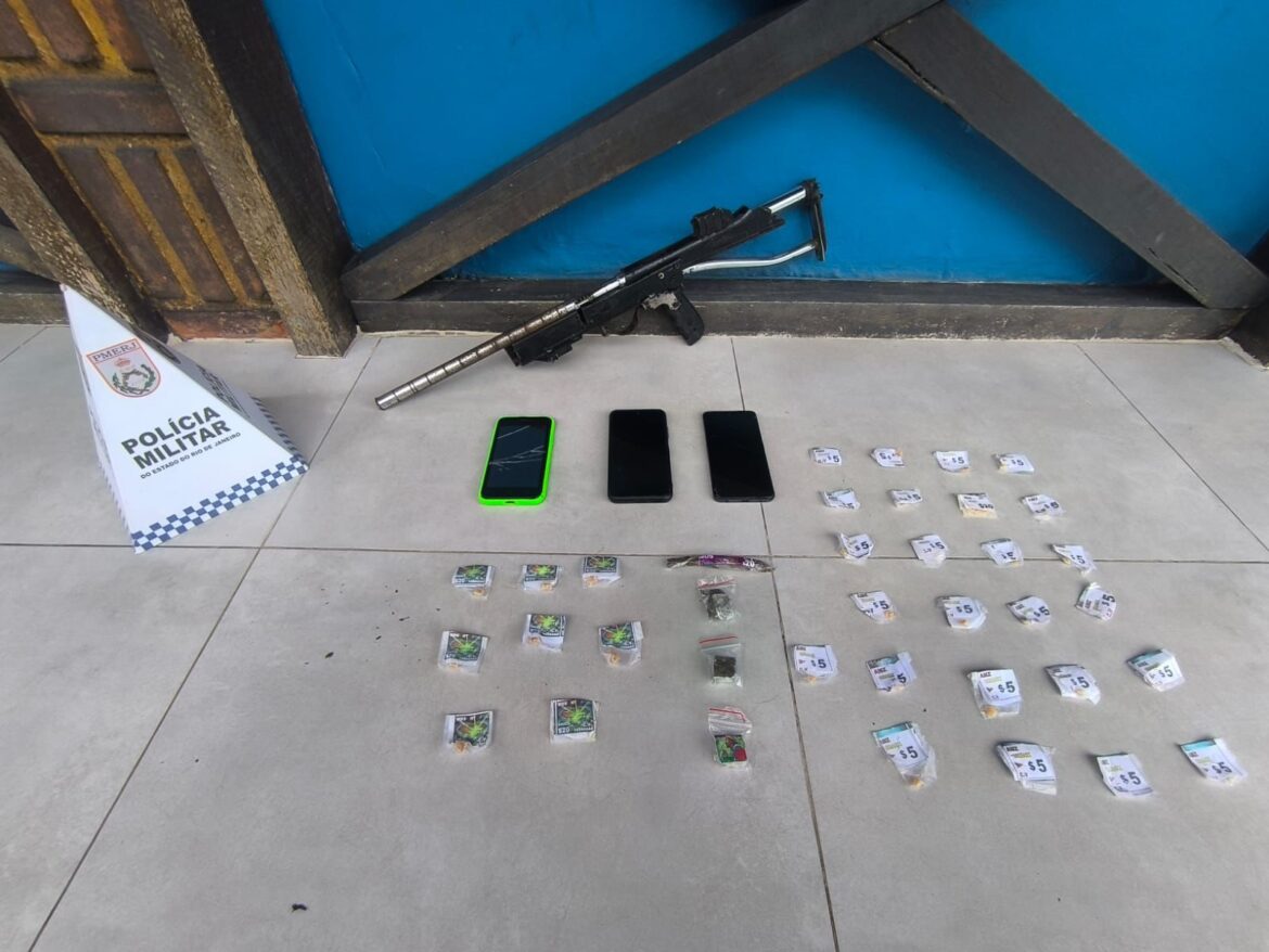 Na ação, foram apreendidas 33 pedras de crack (17g), 4 pequenos tabletes de maconha (27g), uma arma artesanal e três aparelhos celulares.