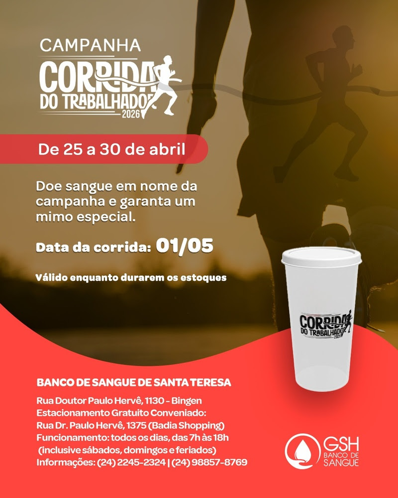 O GSH Banco de Sangue Santa Teresa está engajado na mobilização solidária que antecede o Dia do Trabalhador e anuncia uma ação especial para incentivar a doação de sangue. Até o dia 30 de abril, todos os voluntários que comparecerem para doar receberão um copo exclusivo alusivo à campanha da Corrida do Trabalhador.